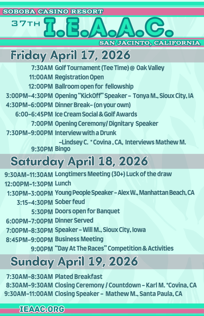 The IEAAC 2026 Event Schedule is below. Please check the Facebook Group for announcements.